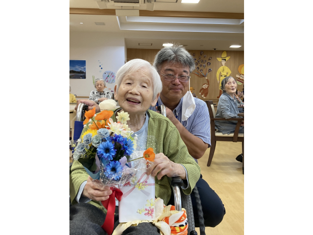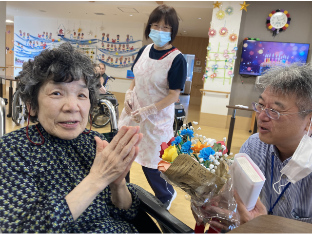 苑長から花束とプレゼントを受け取り、カメラを向けるとニッコリ笑顔!! 皆さんに「おめでとう!」と言われると少し照れている方や嬉し泣きをされている方などが見られました。 8月生まれの皆さん、お誕生日おめでとうございます。