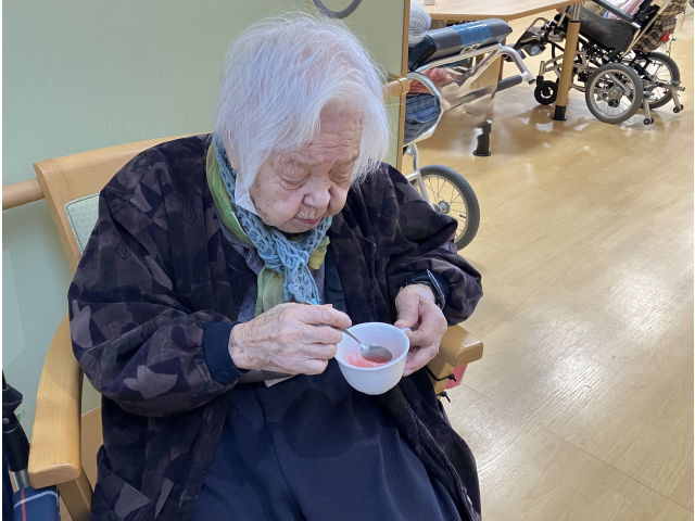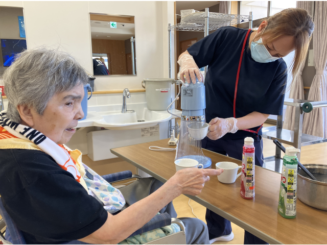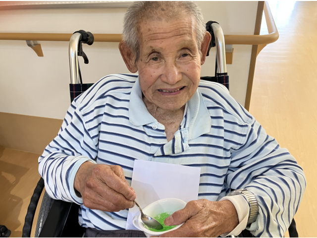 かき氷屋さん登場🍧職員の「かき氷いかがですか~?」の声に、あっという間に利用者さんの列ができました。「イチゴにしようかな~、メロンにしようかな~」「冷たくて美味しいね」と、みなさん喜んでみえました。