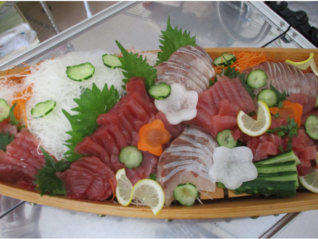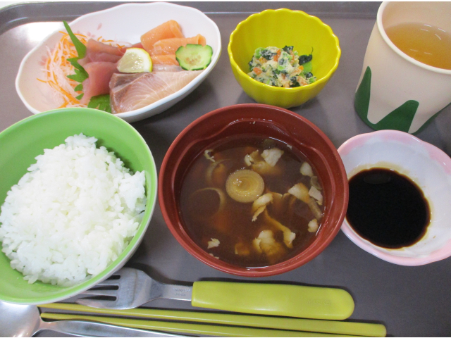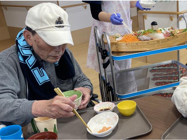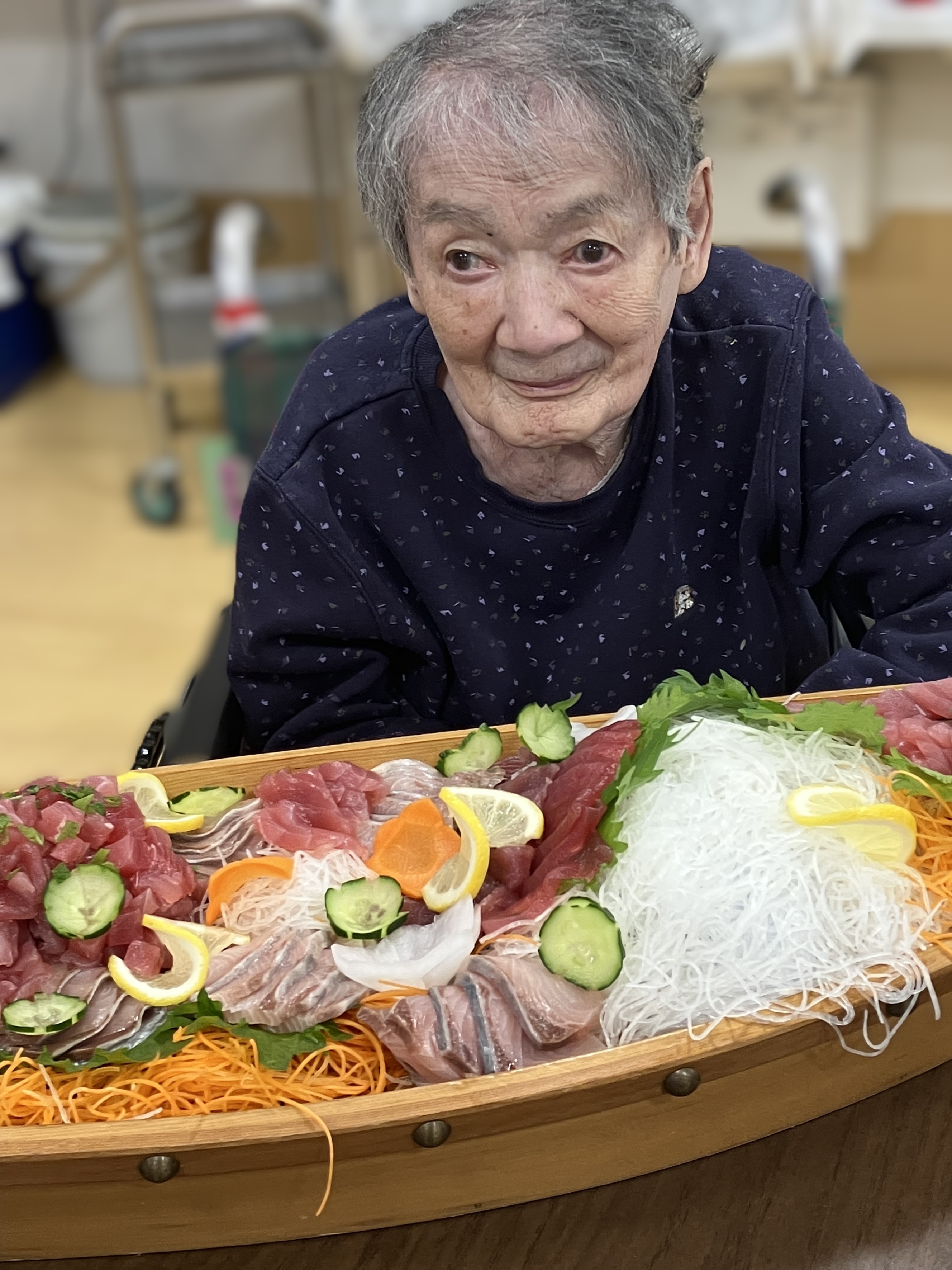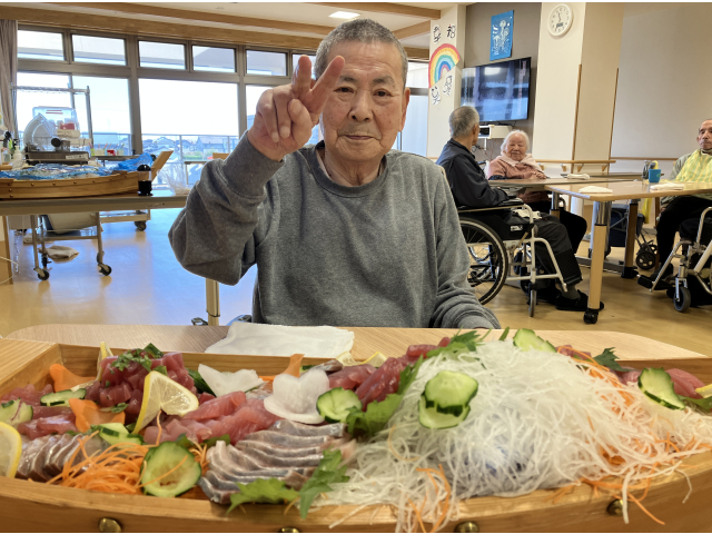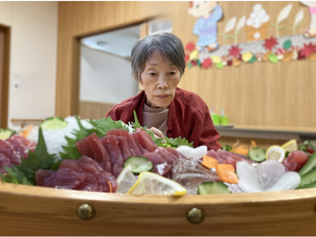 11月26日 本日の昼食は「まぐろ食べ放題」でした。利用者さんの大人気メニューお刺身です。しかも食べ放題!!朝からみなさんお待ちかね。厨房さんに舟盛を作ってきれいに飾っていただき、各町運ばれました。