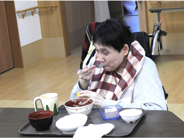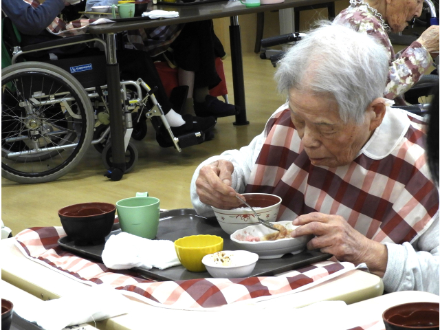 みなさんたくさん召し上がり、「おかわり頂戴~」と、元気な声が聞こえてきます。最後まで食べ続けている利用者さんもみえました。「また食べたいわ」とリクエストも。とっても喜んでいただけました🎵いっぱい食べて、風邪にも負けないように頑張りましょう。