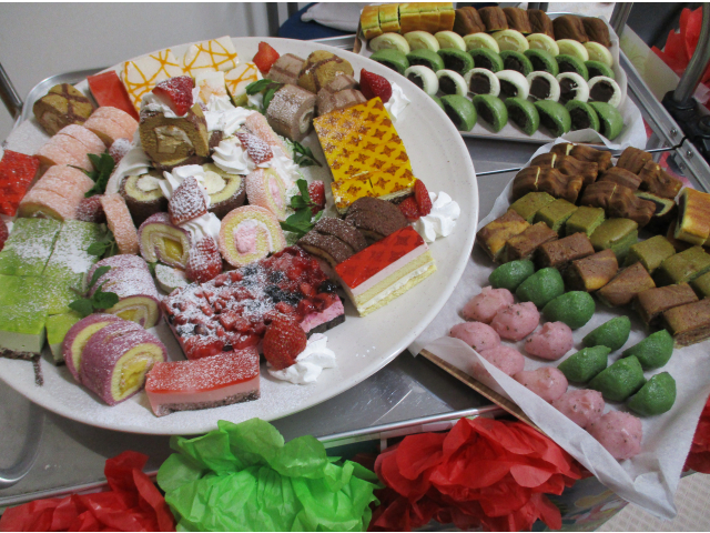 「メリークリスマス、乾杯」の合図でケーキバイイング🍰の始まりです。ラッピングのされたワゴンにケーキに和菓子にプリン✨おかわり用ワゴンが来ると、これは何?ケーキもいいけどどら焼きもいいなぁ~と迷われていました。