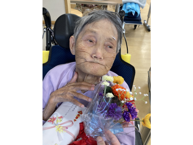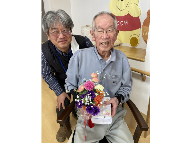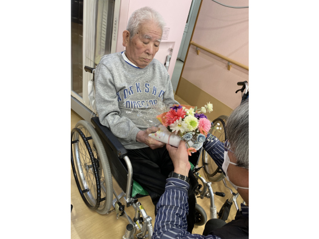 少し寒さが和らぎ、天気の良い日は、職員やご家族と外に出て散歩をされる利用者様を目にする事が増えて来ました。 3月の誕生会では、12日に開催し誕生月の方を皆さんでお祝いしました。 苑長からプレゼントとお花を受け取ると何度もお礼を言われる方やお顔が少し緩む方などいろんな表情が見受けられました。