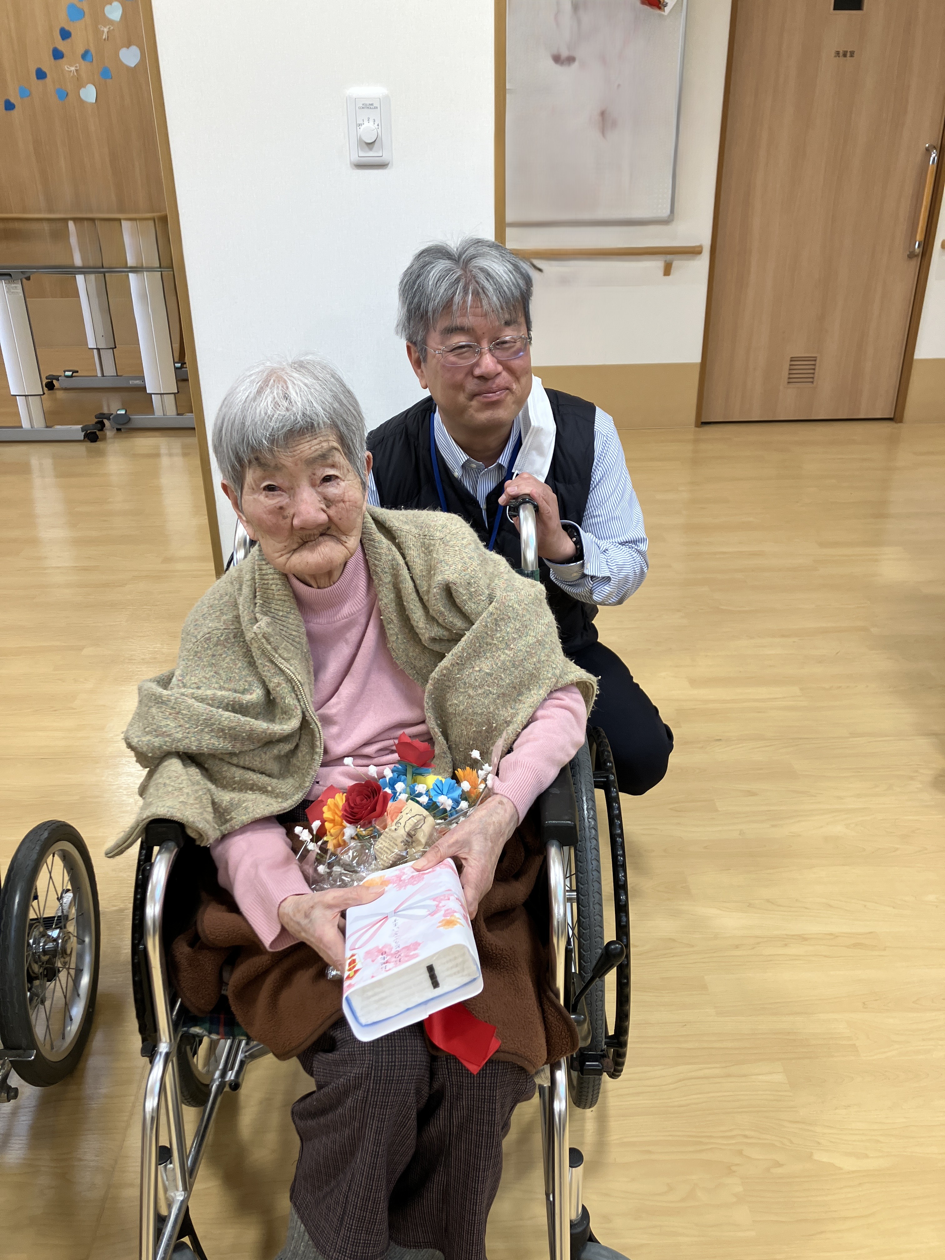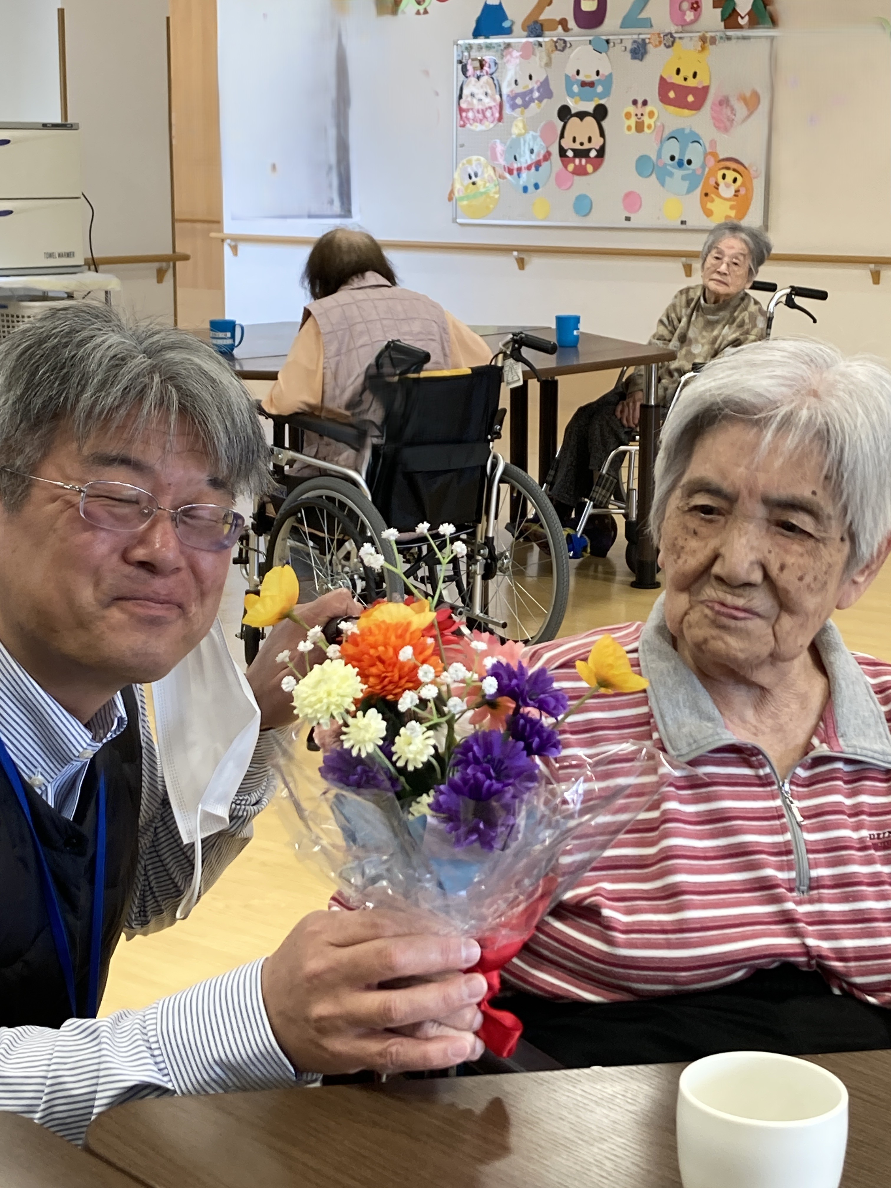 今年度初めての誕生会が開催されました。 苑長が誕生月の方にお花とプレゼントを手渡すと、他の利用者様からも「おめでとう!!」と言われ少し恥ずかしそうにされていました。