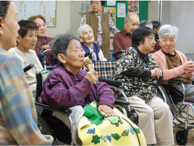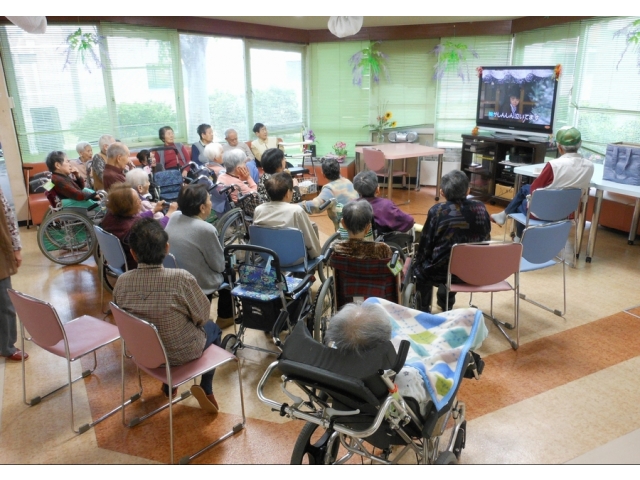 隔週の金曜日には、ボランティア団体「ミナセクラブ」の皆さんにお越しいただき、カラオケを楽しんでいます。人気曲は「星影のワルツ」や「瀬戸の花嫁」などで、皆さんここぞとばかりにマイクを手に取り熱唱されていました。好きな音楽を聞いたり歌ったりすると、自然と顔もほころびますね。