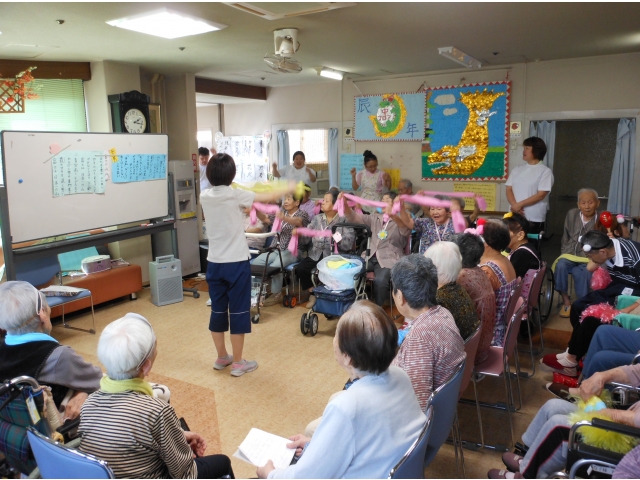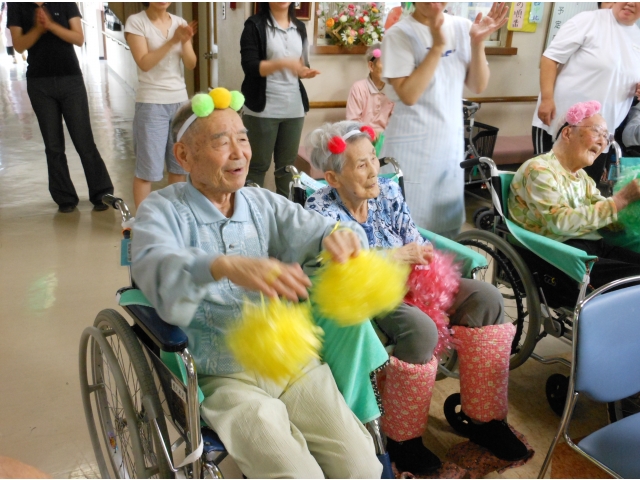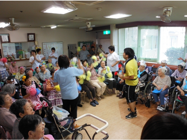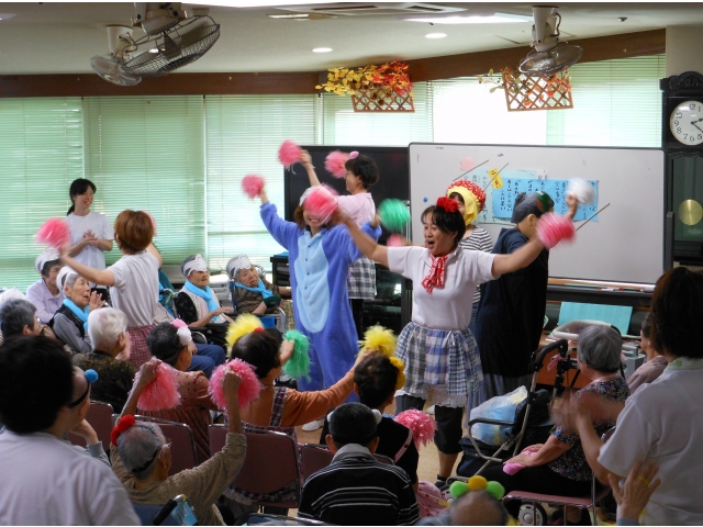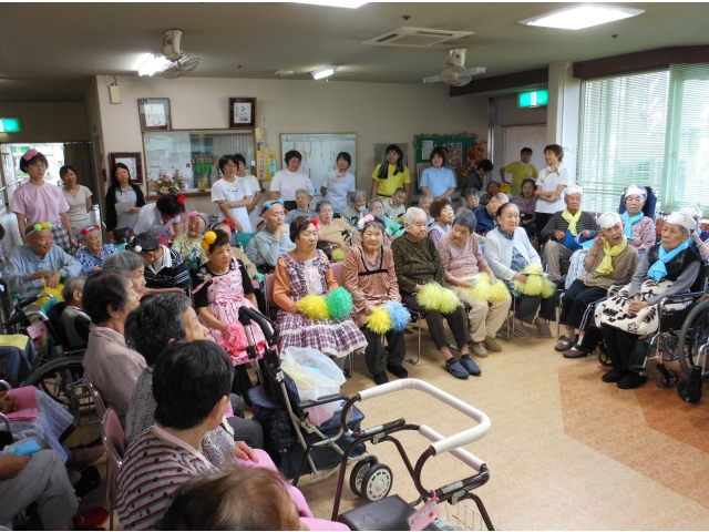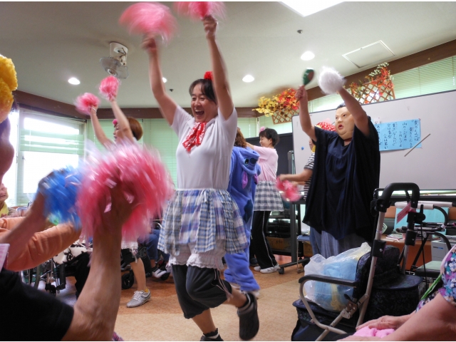 利用者の皆さんが花笠音頭などに合わせて踊りや手拍子を披露してくださると、今度は様々な仮装をした職員がAKB48の「ヘビーローテーション」に合せて歌と踊りを披露。ノリノリ(8分音符)のお祝いとなりました。