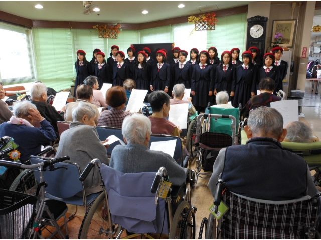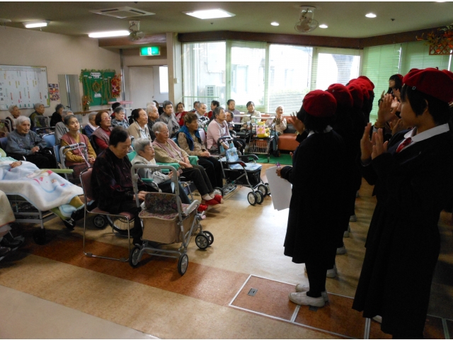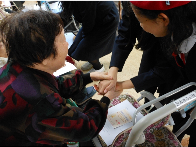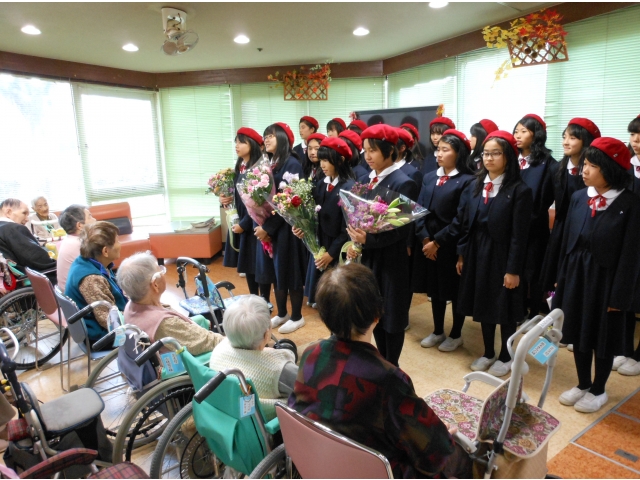 歌や花はもちろんのこと、生徒さん達の心遣いに利用者の皆さんも大変喜んでおられ、涙ぐまれる方もたくさんみえました。