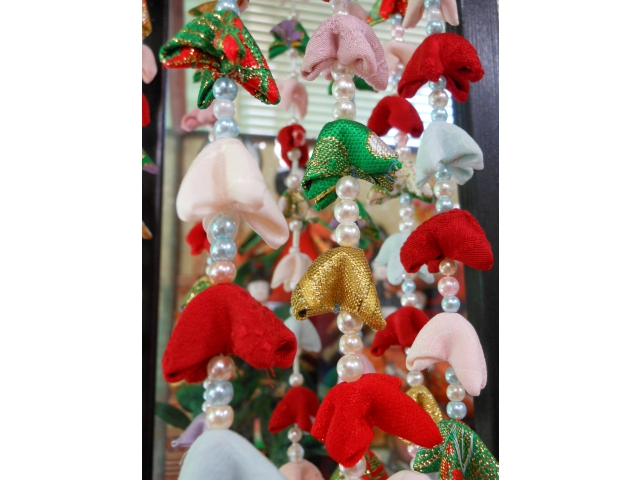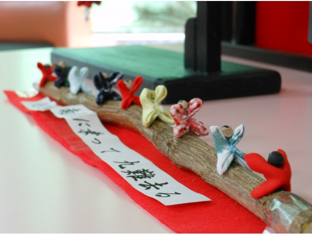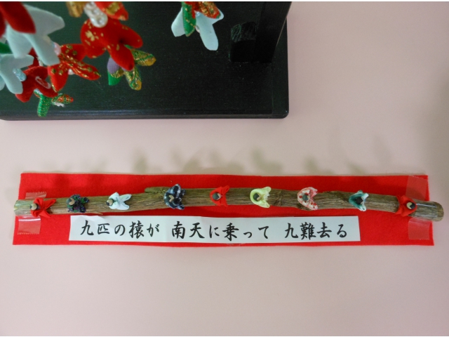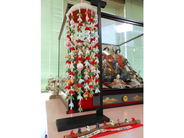 地域の方から雛のつるし飾りをいただきました。 さっそくロビーの雛人形の隣へ飾り、皆さんに楽しんでいただいています。 「九匹の猿が 南天に乗って 九難去る」という縁起の良い言葉が添えられた飾りもあり、可愛らしいと好評です。