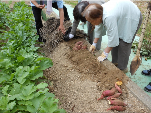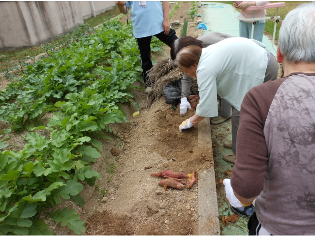 秋は収穫の季節。今日は裏の"瀬戸苑畑"でサツマイモの収穫をしました。 いろいろな面白い形をしたサツマイモがゴロゴロと掘り起こされると、皆さんから歓声があがります。 収穫できたサツマイモは、フロアでのおやつや焼き芋で提供していきたいと考えています。美味しくいただけたらいいですね。