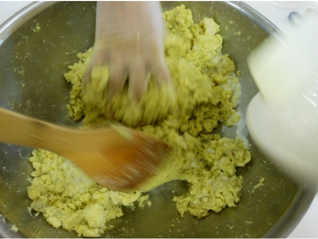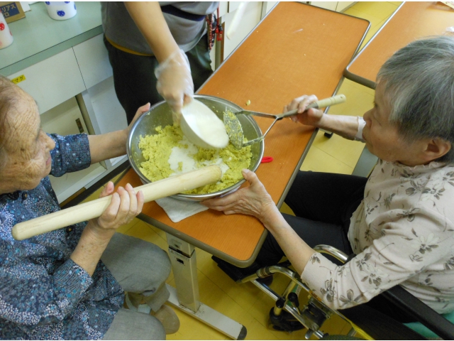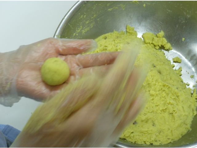 芋をつぶして、生クリーム、砂糖などを入れて練り練り。皆さんにもお手伝いいただきました。
