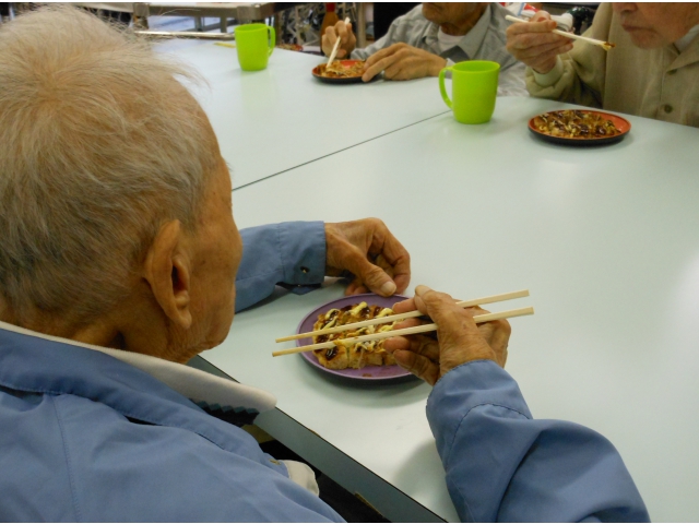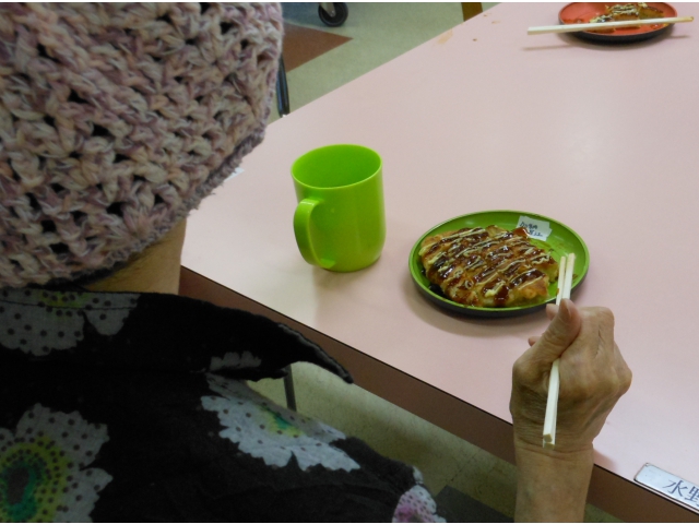 今日のおやつは、ミニお好み焼き。お好み焼きは瀬戸苑の喫茶コーナーでも皆さんに人気です。 ホットプレートで焼くと、美味しそうな香りで食欲もアップ!皆さん綺麗に召し上がっていただけました。