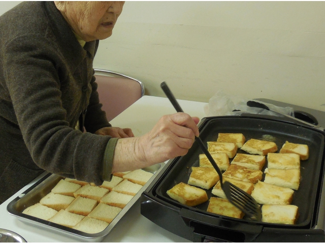 「よし、わしがひっくり返したげるわ。」と皆さんにもお手伝いいただき、ふんわり美味しいフレンチトーストが出来上がりました。