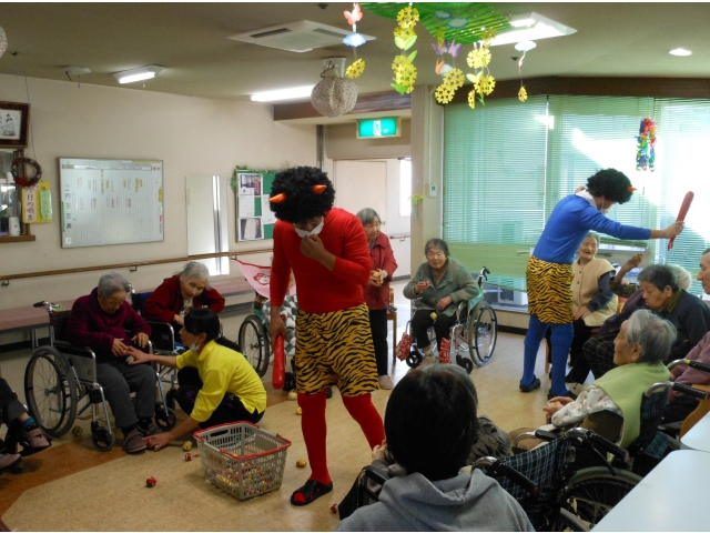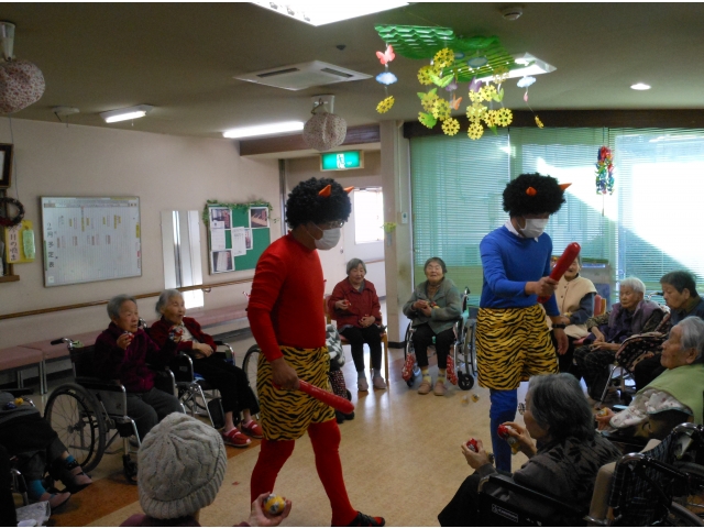 今年も節分会の季節がやってまいりました!どこか見慣れた鬼さん2人が利用者さんに一斉にまめを当てられておりました。