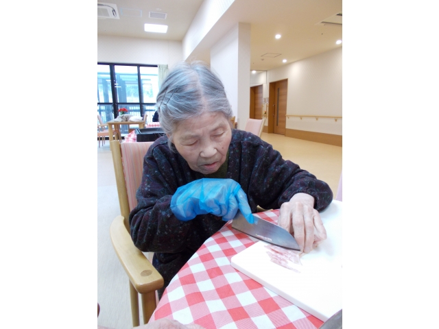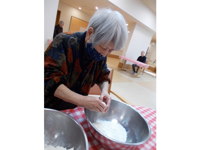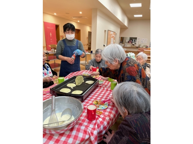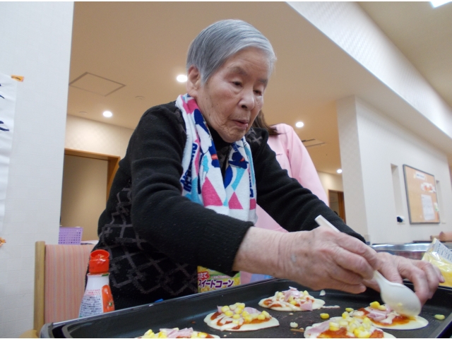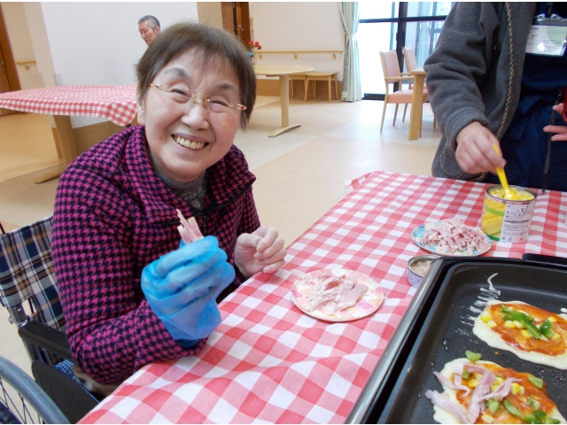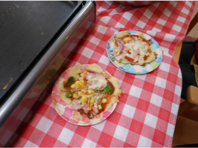 みんなでホットケーキミックスでピザを作りました。この日のつばきフロアはおいしそうなにおいでいっぱい!!