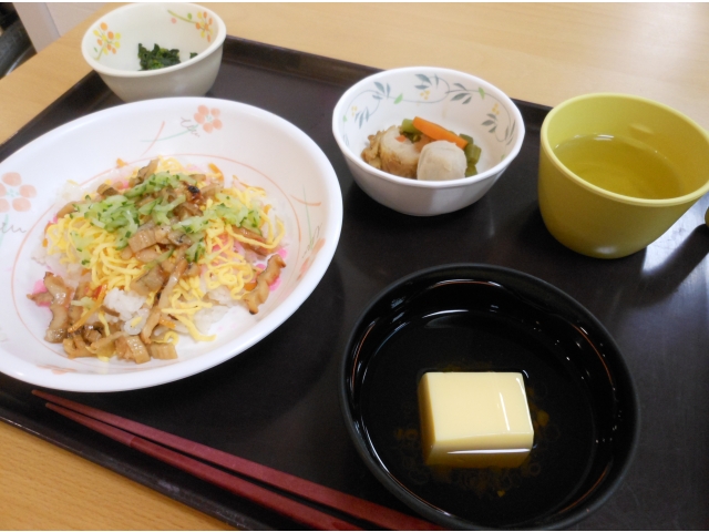 5月5日、こどもの日です。昼食は、ちらし寿司、炊き合わせ、菜の花の辛子和え、玉子豆腐のすまし汁です。