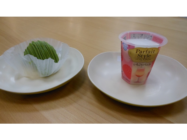 午後から 端午喫茶で 抹茶モンブラン or いちご&バニラプリン を選んでコーヒーと一緒に召し上がりました。