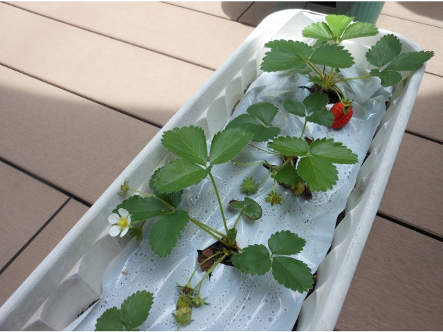 テラスに苺のプランターが増えていました。しかも赤い実がついているでは