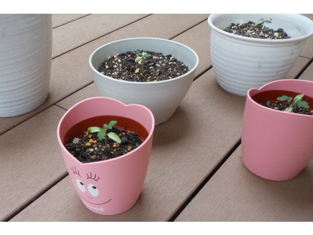 ミニトマトの鉢は、ようやく本葉が出たところでした。
