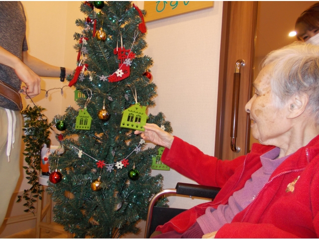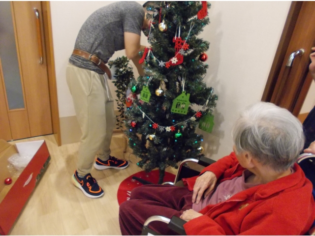 おやつの後は、ユニット入り口のクリスマスツリーに飾り付けをしました。