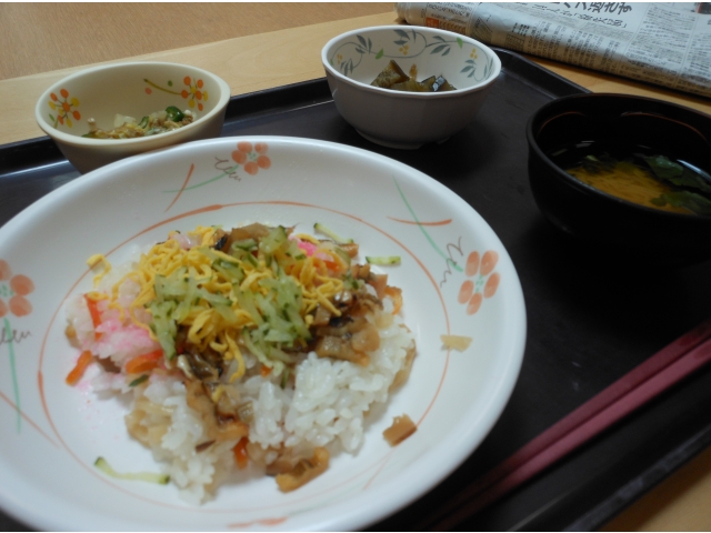 昼のメニューは、ちらし寿司、茄子と枝豆の煮物、オクラ和え、そうめん汁です。