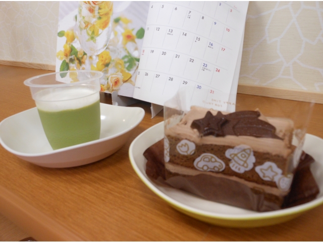 ティータイムに 星型のチョコ付きのケーキ もしくは 抹茶プリンを選んで召し上がっていただきました。