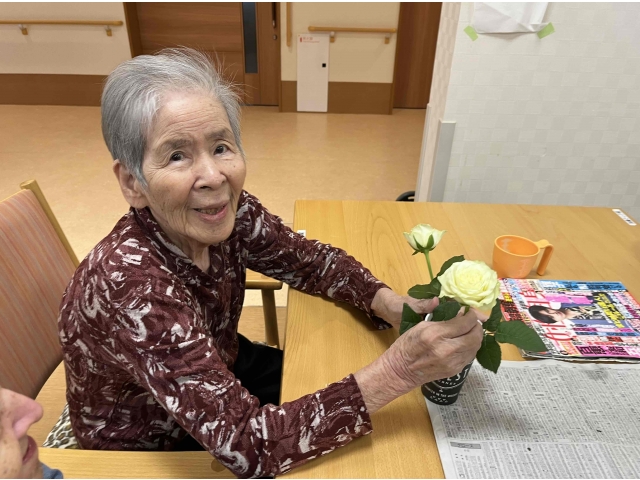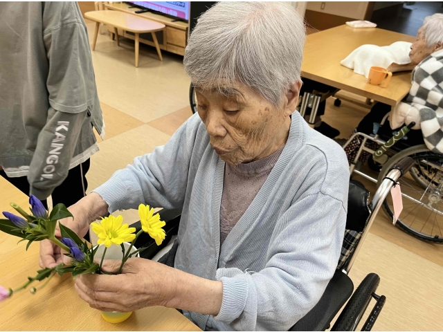 「これ、バラだな、きれいだなぁ」とたくさんある花の中から好みのものを選び楽しそうにアレンジしていたり、