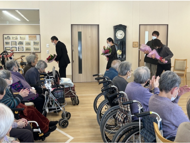 3月29日に、転退職者のお別れ会を行いました。 同法人の他施設へ3名が異動し、苑長が今年度をもってご退職されました。 たくさんお世話になった方々から、最後のごあいさつをいただきました。入居者様から花束贈呈し、感動のお別れとなりました。 瀬戸苑を支えてくださった皆さんの門出に、大きな拍手で送りだしました。 新しい職場へ行っても、お体に気を付けて元気でお過ごしください!