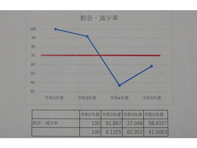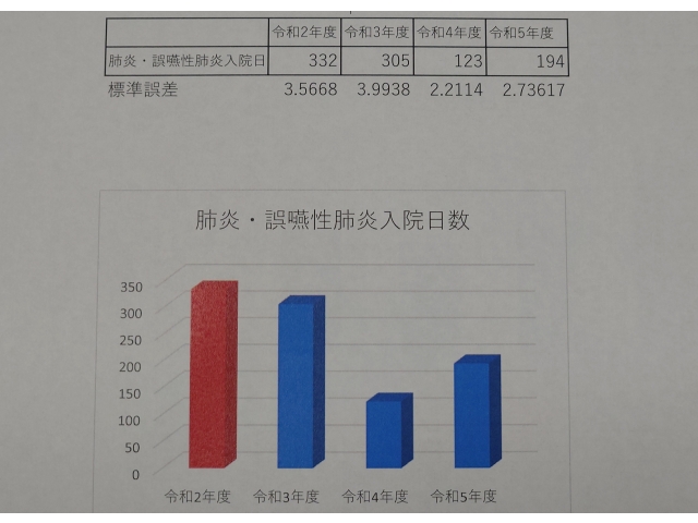 なお、本団経営計画の目標指標は、誤嚥性肺炎を理由とした入院日数を令和2年度に対して30%削減するとなっておりますが、当苑の状況は以下のとおりとなっています。
