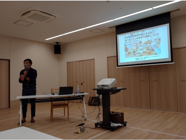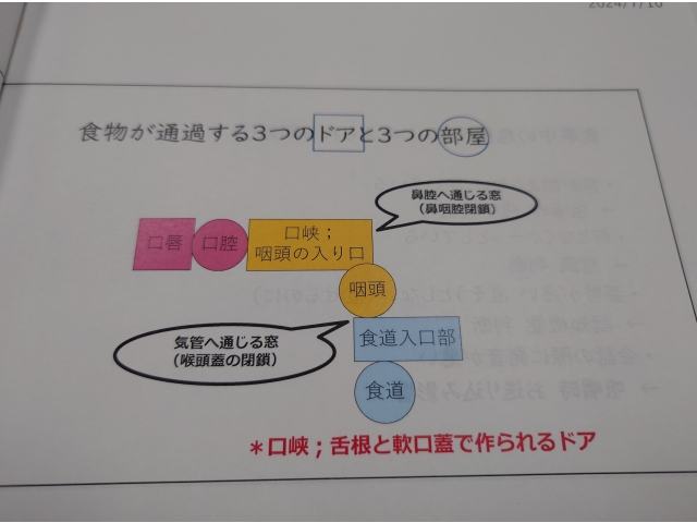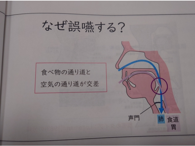 今回の研修では、誤嚥性肺炎が起こるメカニズムに関連した、食事中に起こりうる危険サインと考えられる問題を一緒に考えながら講義を進めていただきました。