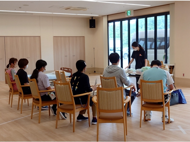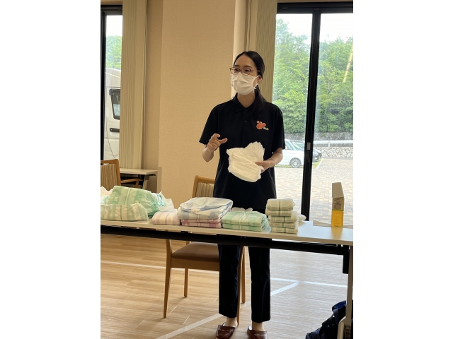 今回の研修では、大きめを選びがちになるアウターのサイズ選びなどの座学以外に、職員自身が初めてオムツを使用するという体験をしてもらいました。