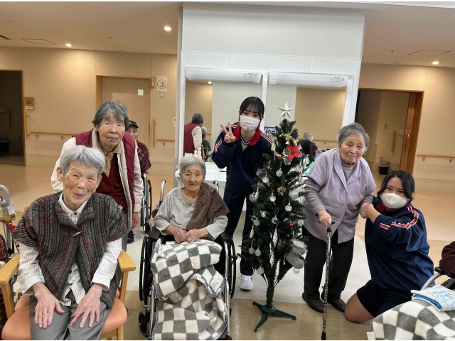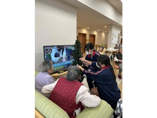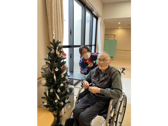 入居者のみなさんで円を作り、真ん中にツリーを置き、皆がやりやすいように自分たちで工夫してやってくれました。お二人の優しい心配りを感じます😊
