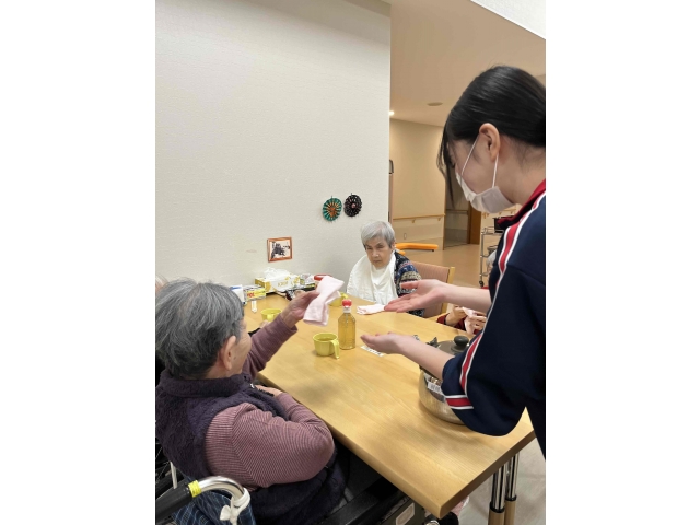 食事の準備では、熱いおしぼりを渡すときに「熱いのでお気をつけくださいね♪」と声をかけていたり、お膳をきれいに整えてからお渡しし、笑顔も一緒に届けてくれていました(*^-^*)
