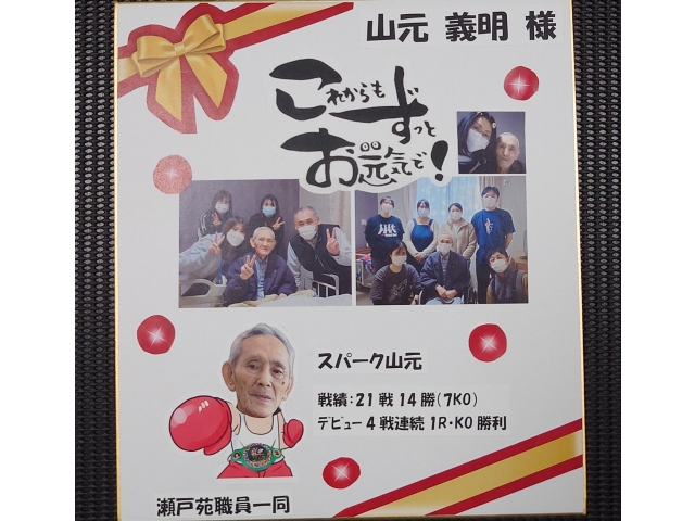 元プロボクサーだった山元さんが喜ぶようボクサーキャラに変身させ当時のリングネームと「とんでもない新人が出てきた」と言われた武勇伝の戦績も掲載しました。