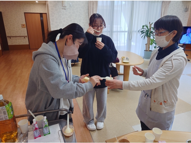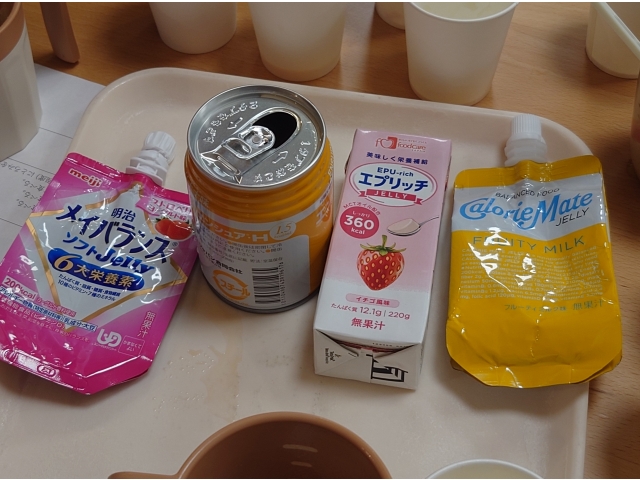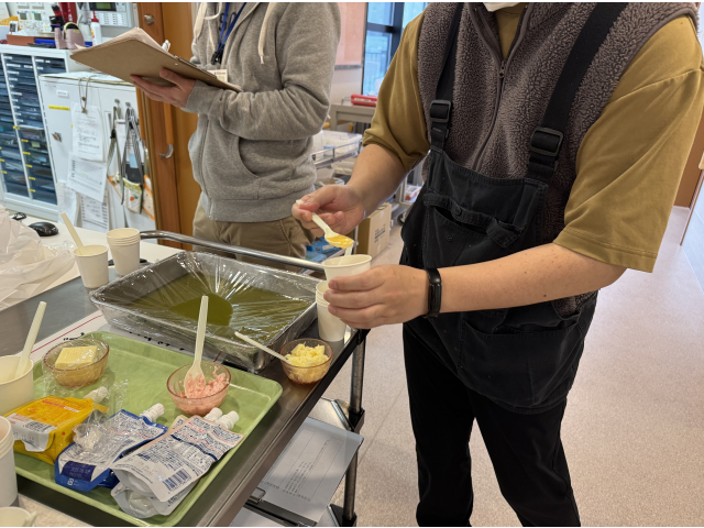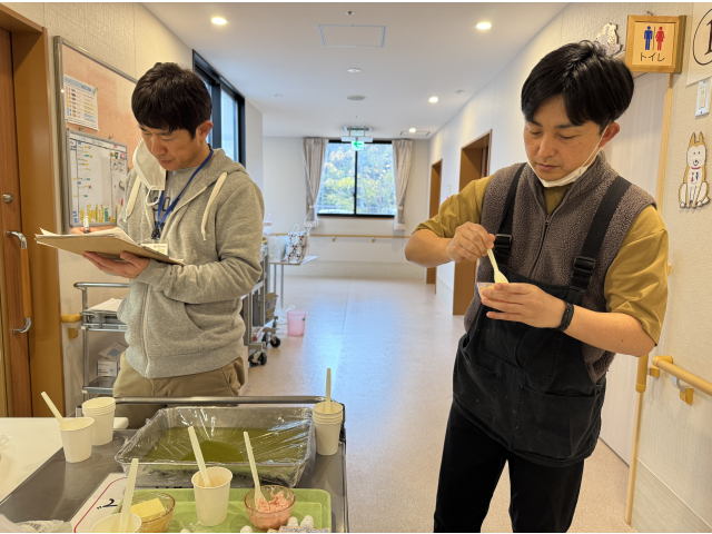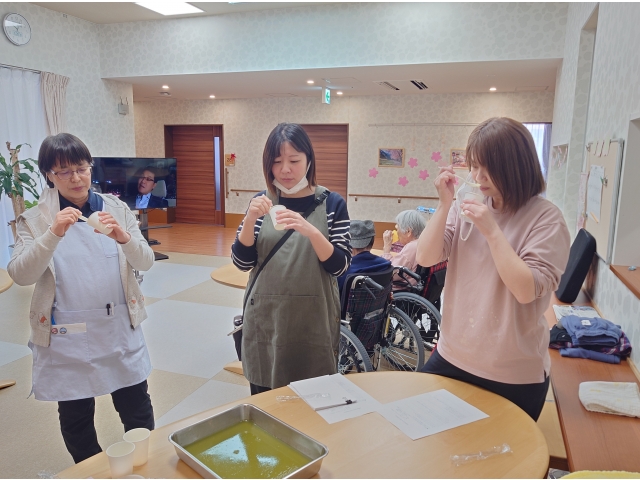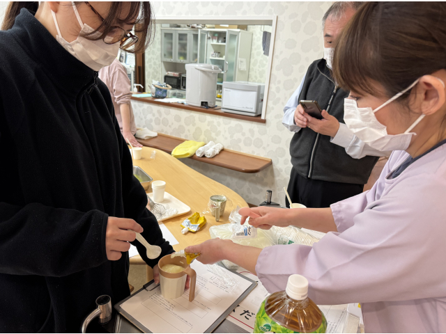 他施設での事故発生事例を受けて、今年の2月から不定期開催で栄養補助食品にトロミ剤を混ぜたものを実際に職員が試食して、高齢者の方がトロミ剤の強弱によりどんな感覚で食べ物を嚥下しているのか実体験してもらいました。