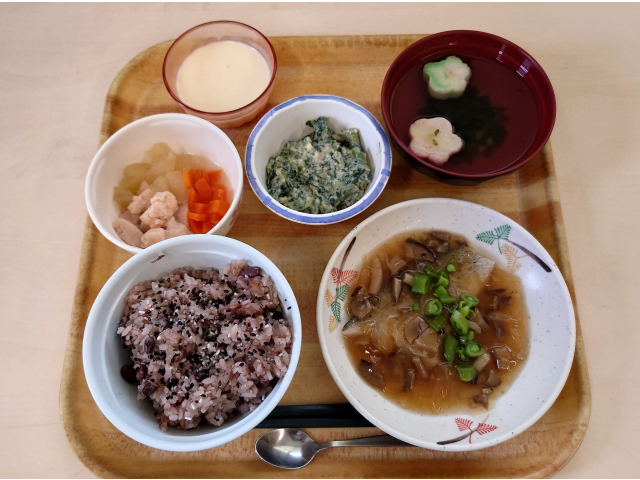 本日の昼食は、誕生会メニューでお祝いのお赤飯✨✨