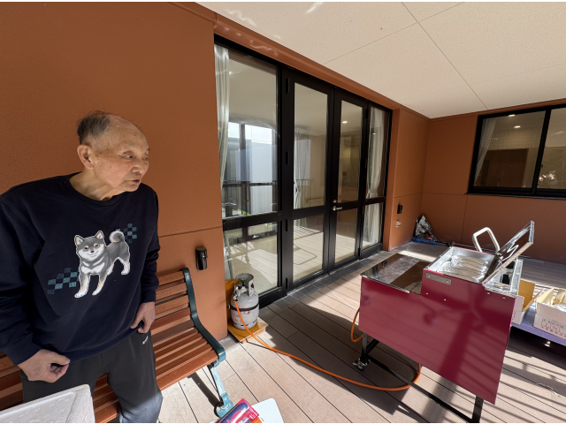 フロアのテラスで焼いていると、香りに釣られて入居者様が覗きに来ました😆