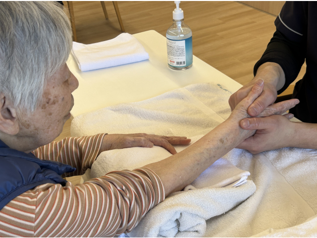 手のひら → 手の甲 → 指 → 関節と、順を追ってやさしくほぐしていきます。