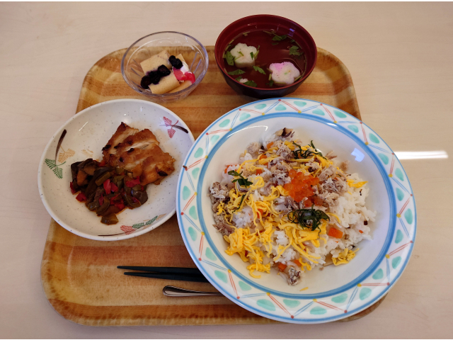 鬼を退治した後は、昼食に節分の行事食(*^^*) *散らし寿司*鶏焼肉*チョコクレープ*キャラメルプリン