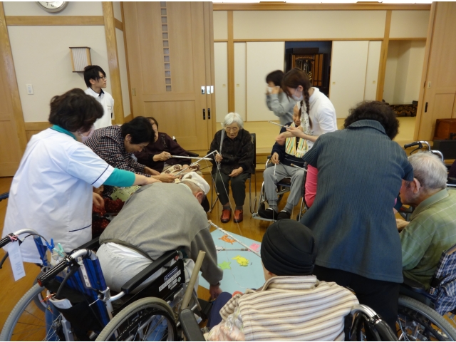 平成27年11月25日(水)午前10時30分から、地域交流スペースにて行いました。 実習中の田原福祉専門学校の3名の生徒さんが、内容を考え、準備をして実施してくれました。 青い色画用紙を池にみたて、その中に魚をいれ、先に磁石のついた釣竿で魚を釣るというレクリエーションです。 3つの池に利用者様が輪になり、魚釣りをしました。 みなさん真剣に魚を釣って楽しんでいました。
