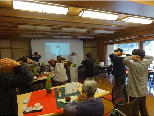 第4回目となった今回は、愛厚ホーム大府苑で作成された「介護予防DVD」を上映し、来店していただいた皆様と当苑の理学療法士が一緒に体を動かしました。