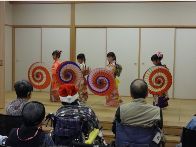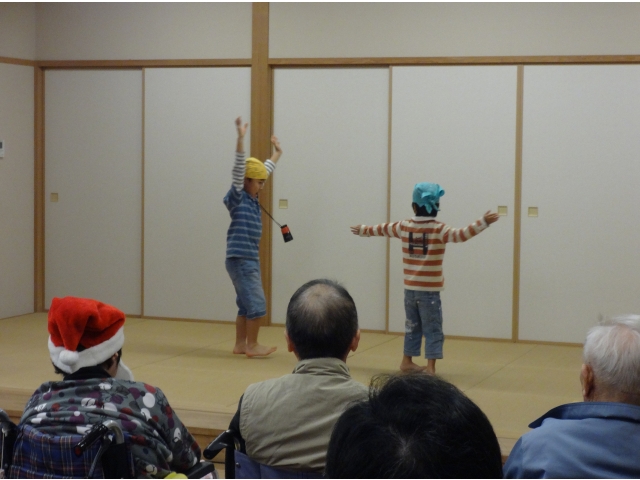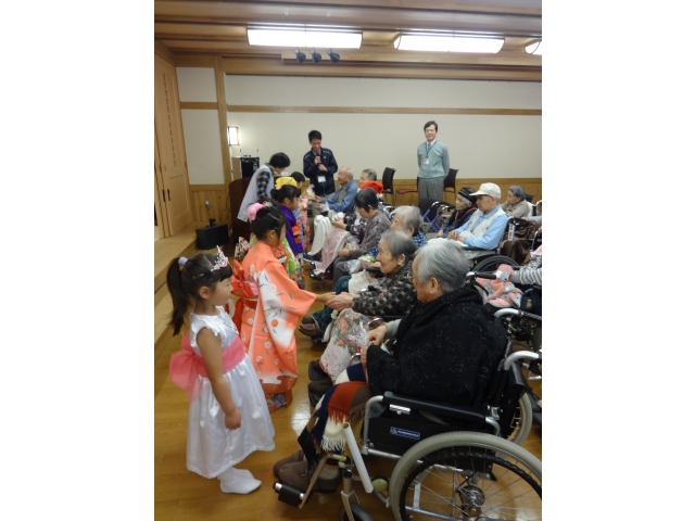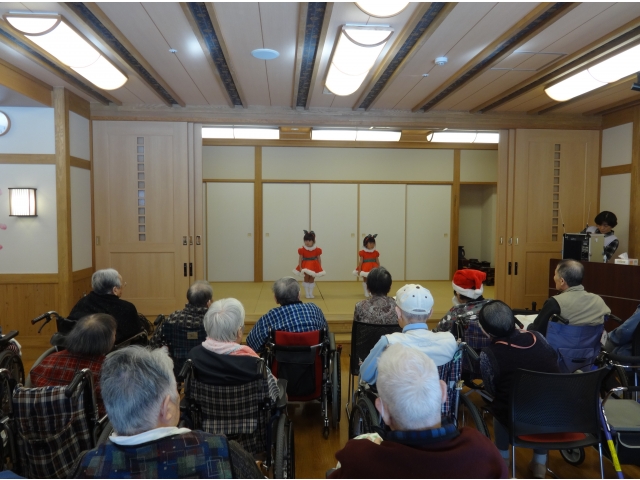 設楽苑のすぐ隣にある、清嶺保育園の園児さん14名が保育園のお遊戯会で披露した踊りを、設楽苑の皆さんへも見て頂きたいとのことで慰問を行いました。かわいい園児さんを前に、入居者様は手を振ったり、拍手をしたりとても楽しそうに踊りを見ていました。