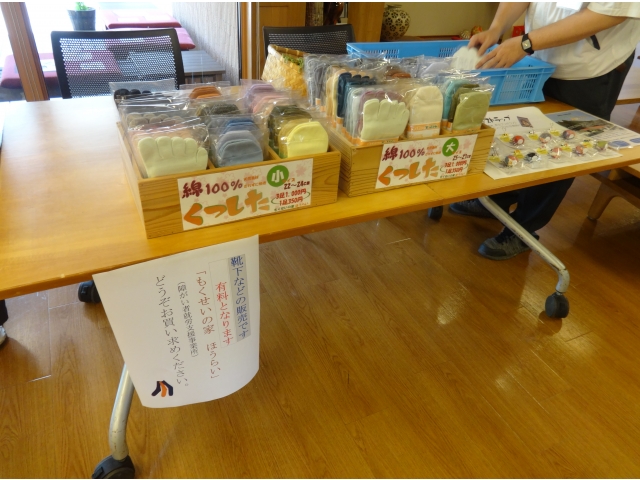 また、就労支援事業所のもくせいの家ほうらい様により、靴下、ぶっぽうそうストラップの販売も行っていただきました。