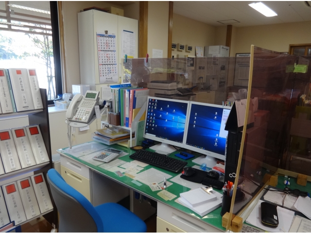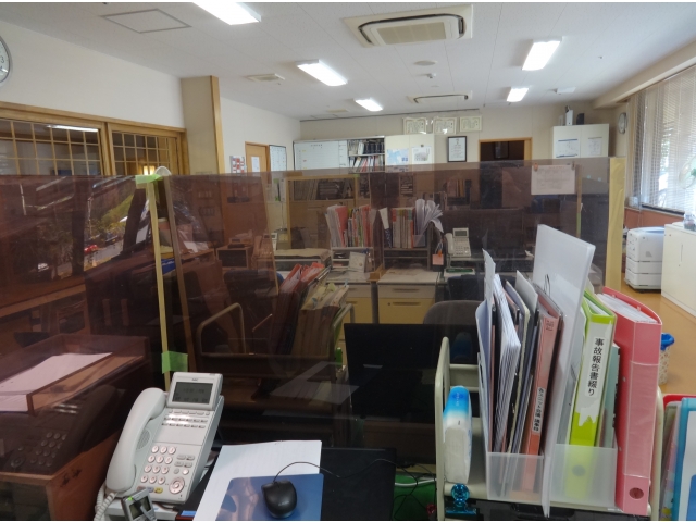 そのような状況の中、事務室では新たに飛沫感染対策として各職員とのデスク間に技術員製作の再利用のアクリル板、窓口へは透明フィルムを設置しました。