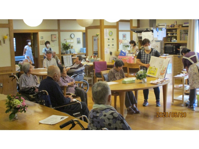 最近はコロナウイルスの影響で面会が思うようにできず、気分が落ち込みがちになってしまっているので、奥三河の名物「五平餅」やデザートとして「フルーチェ(イチゴ味)」を用意し、食事を楽しみながら介護員による絵本寄席「まんじゅうこわい」や、昭和の懐かしい歌謡曲を鑑賞したり、全員で「ふるさと」を歌うことで入居者様達の親睦を親睦を深め気分転換をする事ができました。