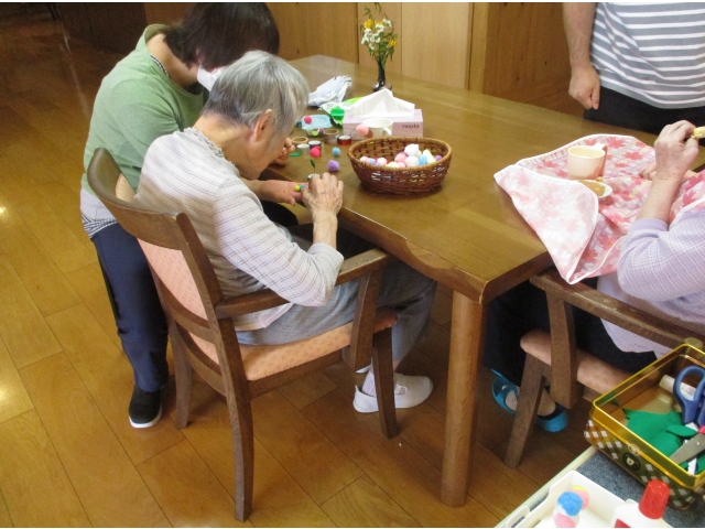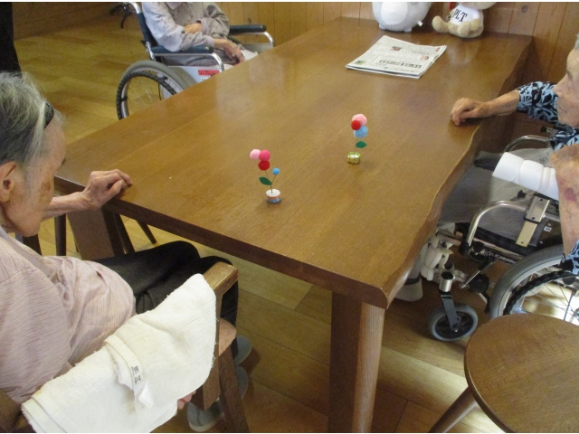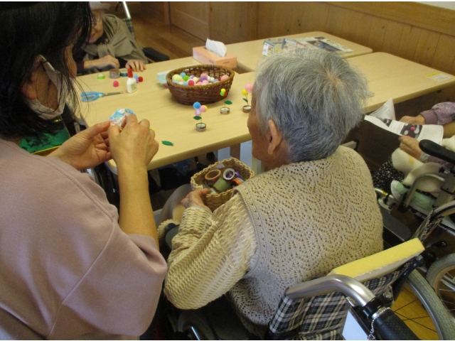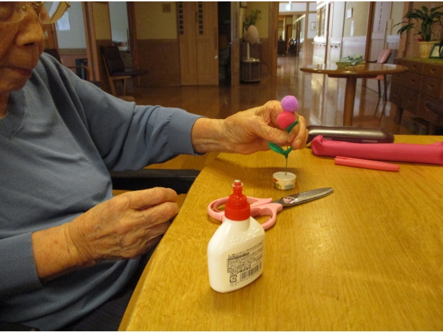 針金に綿球を刺していると「お花よりも団子にみえるね」と楽しそうに笑う場面もありました。各ユニットに、ちいさなお花が咲きました。かわいい花を見つめる入居者様を見て、ほっこりした気持ちになりました。