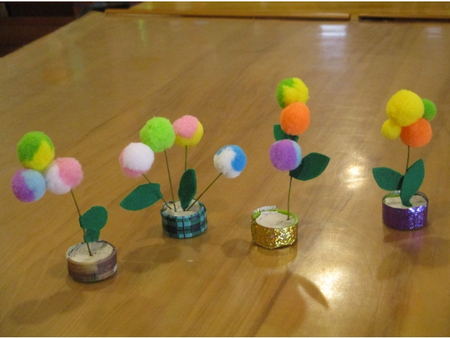 6月20日手芸クラブで「カラフル綿球」を使って「花」を作りました。 ペットボトルの蓋に粘土を詰めて土台に。針金に綿球を付けて葉っぱを付けたら完成です。かわいいミニ花ができました‼