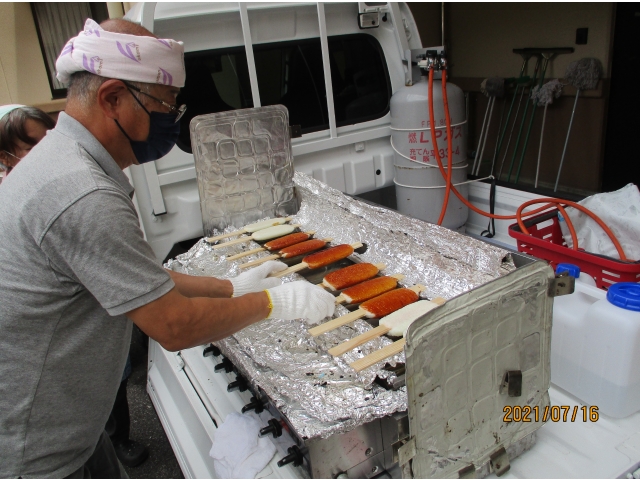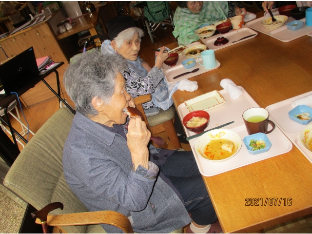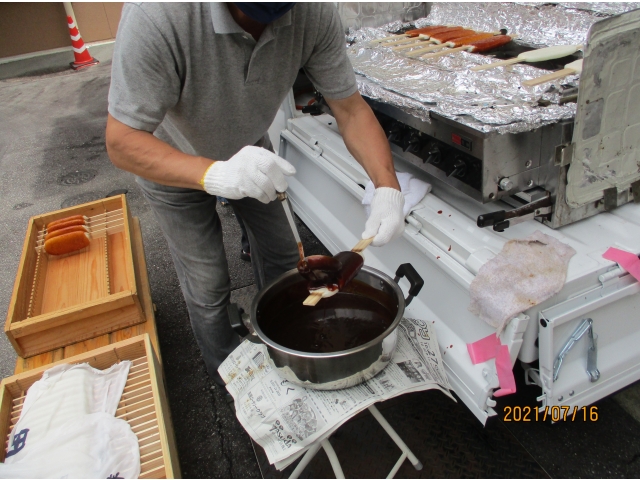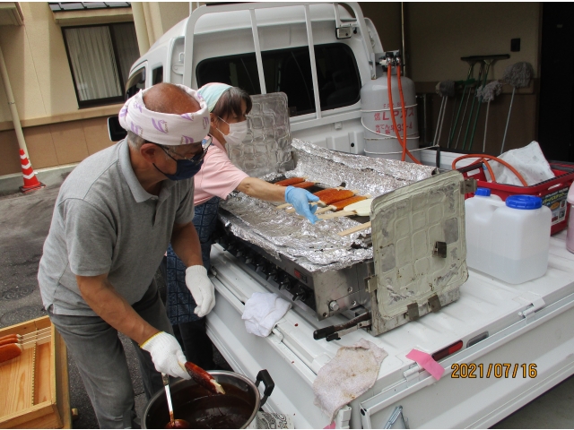町内の『田峯直売所』さんが出張して五平餅を焼いてくれました。焼きたてのアツアツを頬張り、口に味噌をつけて美味しそうに味わう入居者様。