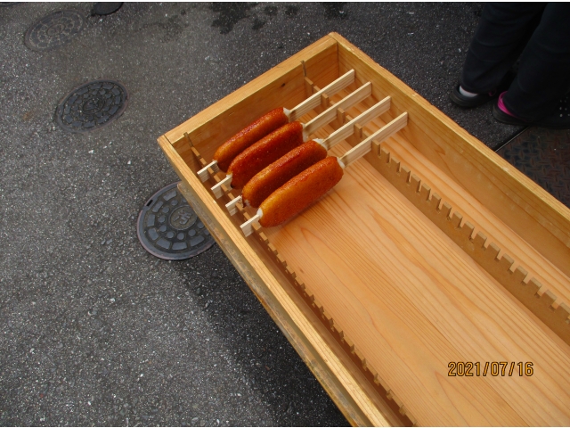 「若い頃にはよう作ったわ。お祭りやお客様が来ると、囲炉裏に炭を焚いて焼いたもんだ。うちのはこんなに大きかったぞん。」と笑顔いっぱいで教えてくださいました。