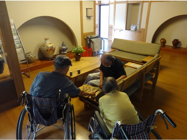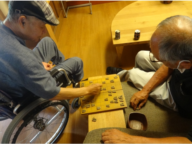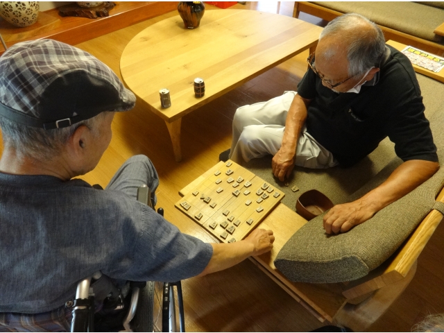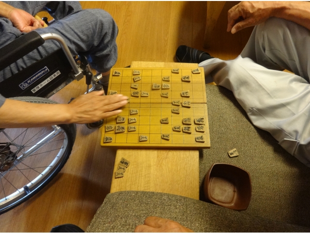 「本当にそれでいいの?」「大手!」 今朝もロビーに元気な声が響いています。 入居者のN様の3日に一度の朝の楽しみは、宿直代務員さんと指す将棋。代務員さん曰く、N様はとても強くて一度も勝てたことが無いとのこと。 「ボケ防止にはちょうど良い!」とN様は笑顔を浮かべ意気揚々と将棋を指します。 駒の進め方をイメージし、何手も先を予想する。脳に負荷を与え活性化させる将棋は、N様にとって趣味を生かした、まさに認知症予防です。