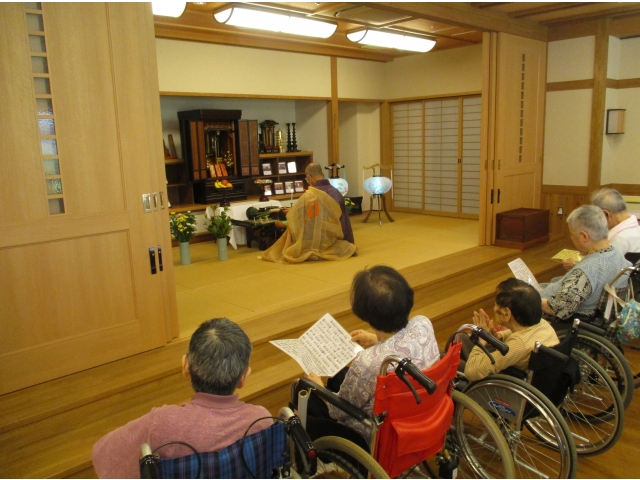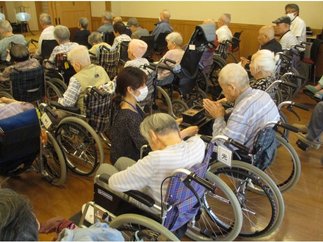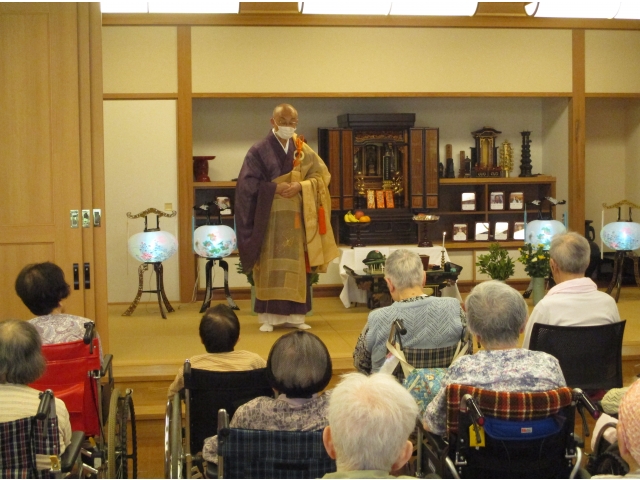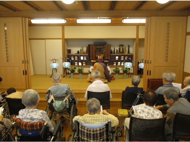 令和3年8月10日(火)晴れ 本日、愛厚ホーム設楽苑では、令和3年度初盆法要を執り行いました。 福田寺-鷲山住職の読経に続き、参加者全員が焼香を行い、この一年間に旅立たれた入居者様の霊を弔いました。