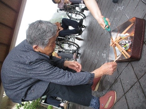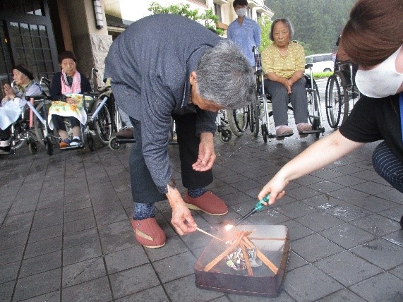 8月13日(金)本日は雨とゆう残念な天気となりましたが、玄関で入居者様と一緒に迎え火を焚きました。今年、設楽苑を退所されて初盆を迎えられる方が、15名いらっしゃいます。皆さん手を合わせていました。また、中には般若心経を唱えている方も、、、